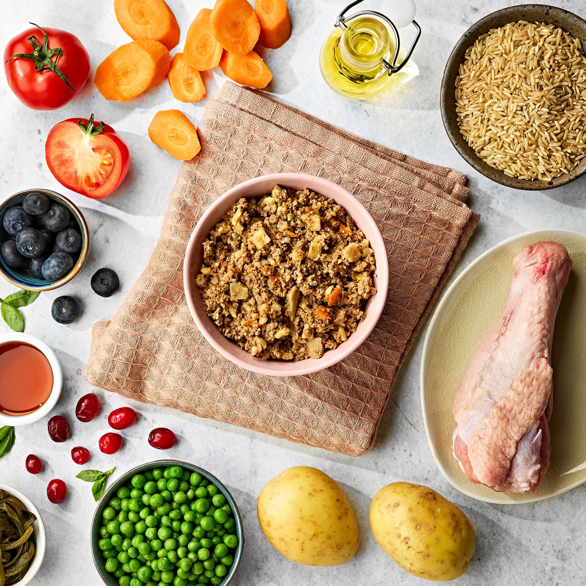 Duck 60%, Brown Rice 15% (6.34% from Dried Brown Rice), Vegetables 15% (from 2.68% Dried Carrot, Peas and Potato), Minerals, Sunflower Oil 0.75%, Salmon Oil 0.3%, Dried Tomato, Dried Kelp, Dried Basil